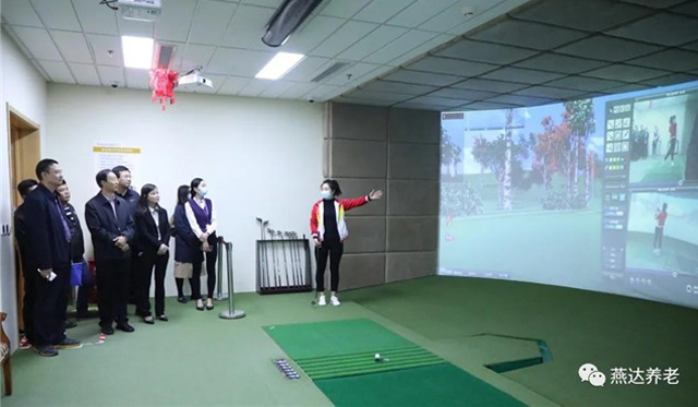 在燕達養護中心,調研組一行參觀考察了賓館式養護區、家居式養護區、老年病科、老年大學、書畫室、3D模擬高爾夫球館、健身俱樂部及相關文娛配套設施。
